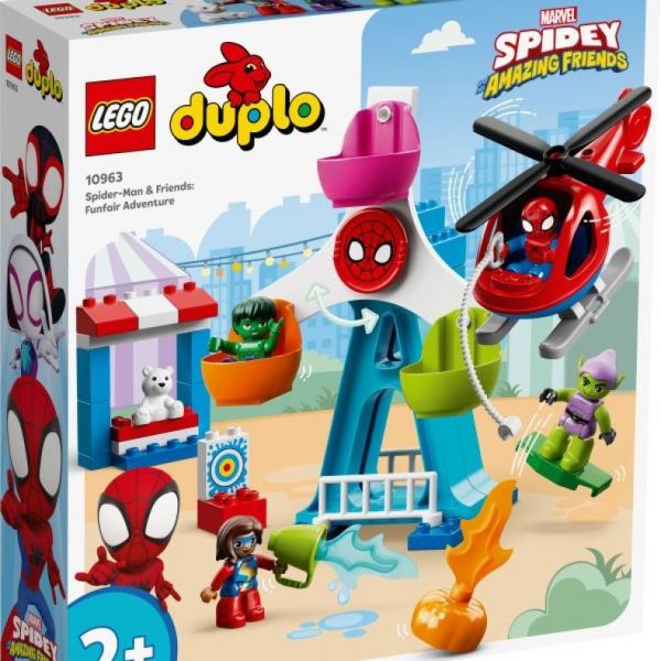 Fans der TV-Show Spidey und seine Super-Freunde auf dem Disney+ Kanal werden das Set LEGO DUPLO Marvel Spider-Man & Friends: Jahrmarktabenteuer (10963) lieben. Mit dem Spider-Man Spielzeug zum Bauen können Kleinkinder kreative Rollenspiele erkunden und wahre Superhelden Abenteuer erleben. Dieses Bau- und Spielspielzeug ist eine ideale Einführung in die Welt der Marvel-Superhelden. Junge Fans der Marvel TV-Show Spidey und seine Super-Freunde auf dem Disney+ Channel werden die DUPLO Figuren Spidey, Hulk, Ms. Marvel und Green Goblin in diesem vielseitigen, baubaren Spider-Man-Spielset wiedererkennen. Kinder können mit der Hulk Figur und der Green Goblin Figur und seinen Freunden den LEGO Freizeitpark erkunden, eine Fahrt auf dem sich drehenden Riesenrad machen, brennende Kürbisbomben abschießen, mit einer Wasserpistole spielen und einen Hubschrauber Spielzeug mit drehenden Rotoren fliegen und so wichtige Fähigkeiten entwickeln, während sie sich auf fantasievolle Superhelden-Abenteuer begeben. Eltern können wertvolle Entwicklungsschritte miterleben, da LEGO DUPLO Marvel baubare Spielzeuge kleinen Kindern unbegrenzten Spaß, Selbstausdruck und freudige Entdeckungen ermöglichen. LEGO DUPLO ist ein Spielzeug für Kleinkinder ab 2 Jahren, damit Kinder ihre motorischen Fähigkeiten und kreatives Denken spielerisch erlernen. Das Set ist über 28 cm hoch, 20 cm breit und 17 cm tief. Enthält 41 Teile.