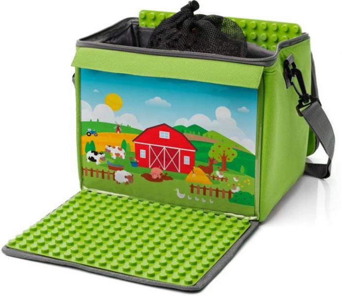 Fantifant Baustein-Tasche mit ausklappbarer Bauplatte kompatibel mit LEGO DUPLO (GRÖSSE XL). Einzeln in bunt bedrucktem Karton verpackt. Weiche, leicht gefütterte Tasche mit separatem Netzbeutel für Bausteine. Ausklappbare Spielplatte kompatibel mit großen Bausteinen. Mit Klett befestigt, kann zur Reinigung entfernt werden. Zweite Bauplatte verstaut im Innenfach. Längenverstellbarer, abnehmbarer Tragegurt mit Schulterpad. Hintergrundmotiv kann nach Beliebengegen gegen eigene Zeichnungen ausgetauscht werden.