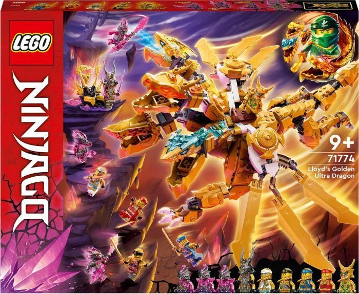Kinder ab 9 Jahren können ihre Lieblingsszenen aus der TV-Serie NINJAGO: Crystallized mit dem Spielset Lloyds Ultragolddrache (71774) mit einem 4-köpfigen goldenen Drachen-Spielzeug und 9 Minifiguren nachspielen. Das LEGO NINJAGO Set enthält NINJAGOs größten Drachen aller Zeiten und viele spannende Actionfiguren. Die Drachen-Figur verfügt über 4 Köpfe, äußerst bewegliche Beine und einen Schwanz sowie ein Flügelpaar, das sich in 3 Klingen entfaltet – alles in Gold! Die 9 LEGO NINJAGO Mini-Figuren in diesem Set enthalten einen exklusiven goldenen Oni-Lloyd, den Goldenen Cole, Goldenen Zane, Goldenen Kai und Goldenen Jay, die alle mit ihren goldenen Elementarwaffen ausgestattet sind, sowie der Kristallkönig, 2 Vergeltungsstein-Grobiane und einen Vergeltungsstein-Krieger mit glänzenden Waffen. Kinder können den epischen finalen Showdown der TV-Serie NINJAGO: Crystallized miterleben! Sie müssen den Ninjas helfen, die von der Vergeltungsstein-Armee erbeuteten Elementarwaffen zurückzuerobern. Achtung: Sie sind alle mit ihren eigenen gefährlichen Waffen bewaffnet. Kleine Ninjas können mit Lloyd auf dem Rücken seines 4-köpfigen Drachen in die Schlacht reiten, um den Kristallkönig zu besiegen. Sie müssen gewinnen, um NINJAGO City zu retten! Die interaktive Bauanleitung zu diesem Spielset bietet noch mehr Bauspaß. Diese digitale Anleitung ist in der kostenlosen LEGO Building Instructions App für Smartphones und Tablets verfügbar. Funktionen zum Vergrößern und Drehen der virtuellen Modellansicht lassen junge Kinder das Modell schon beim Bauen betrachten. Ihren Baufortschritt können sie jederzeit in der App speichern. Lloyds Ultragolddrache ist über 17 cm hoch, 54 cm lang und 30 cm breit. Nach dem Spielen kann der imposante Drache einfach im Kinderzimmer ausgestellt bleiben. Enthält 989 Teile.